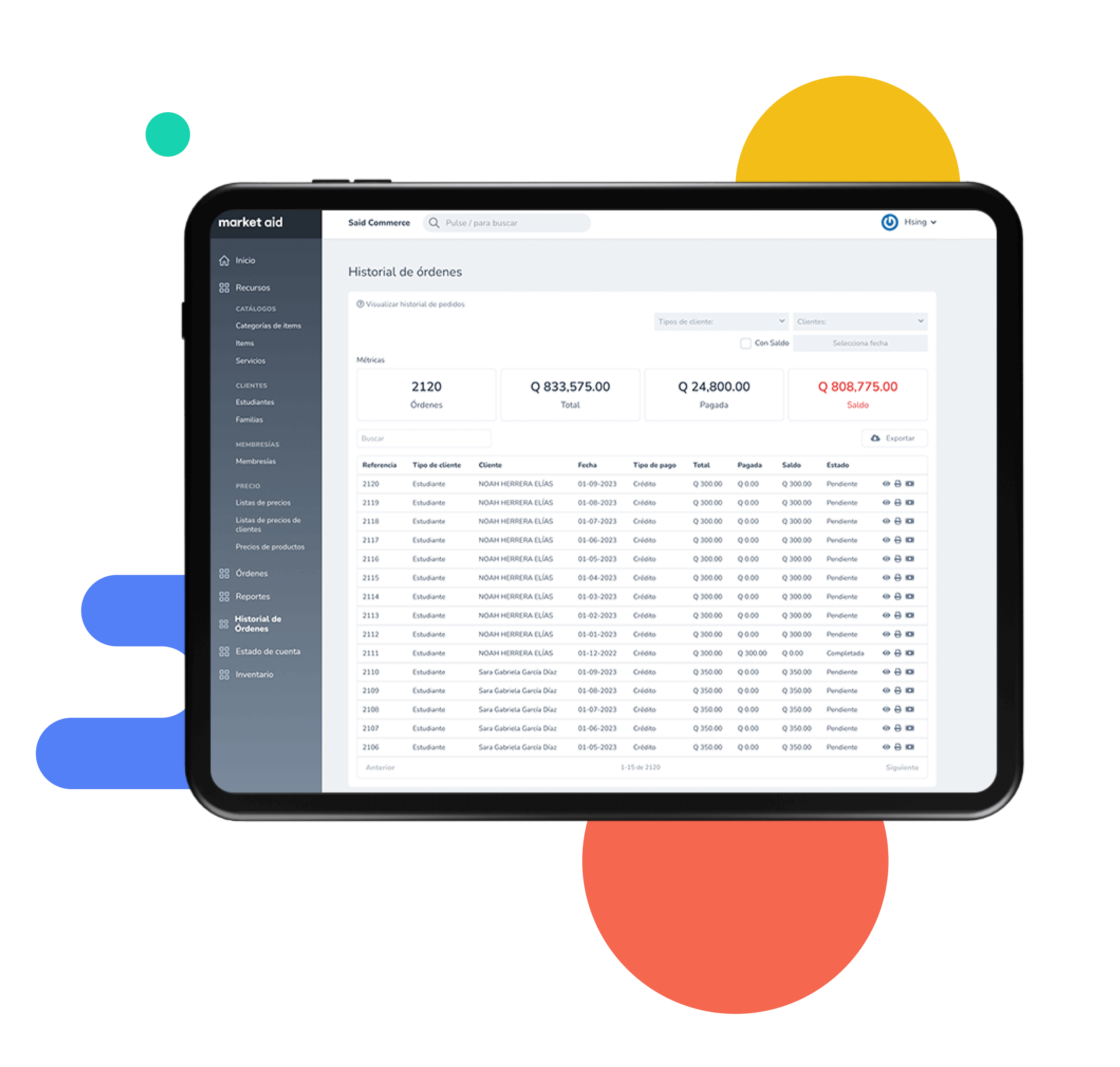 Market Aid es una solución de punto de venta para academias, gimnasios, colegios y otras instituciones que brindan servicios de suscripción, clases, eventos o bookings.